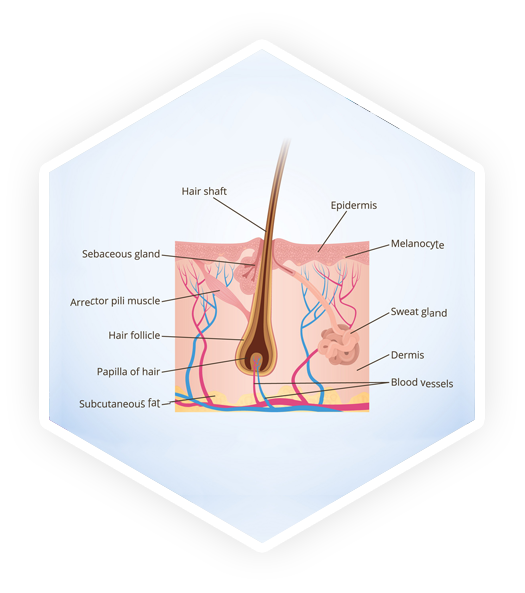 Hair is made up of different separate structures. In simple language we can understand it by dividing hair in two parts – below the skin and above your skin. The hair follicle is the part below the skin, and the hair shaft is what you see above your skin. Hair follicle sits above a dermal papilla.